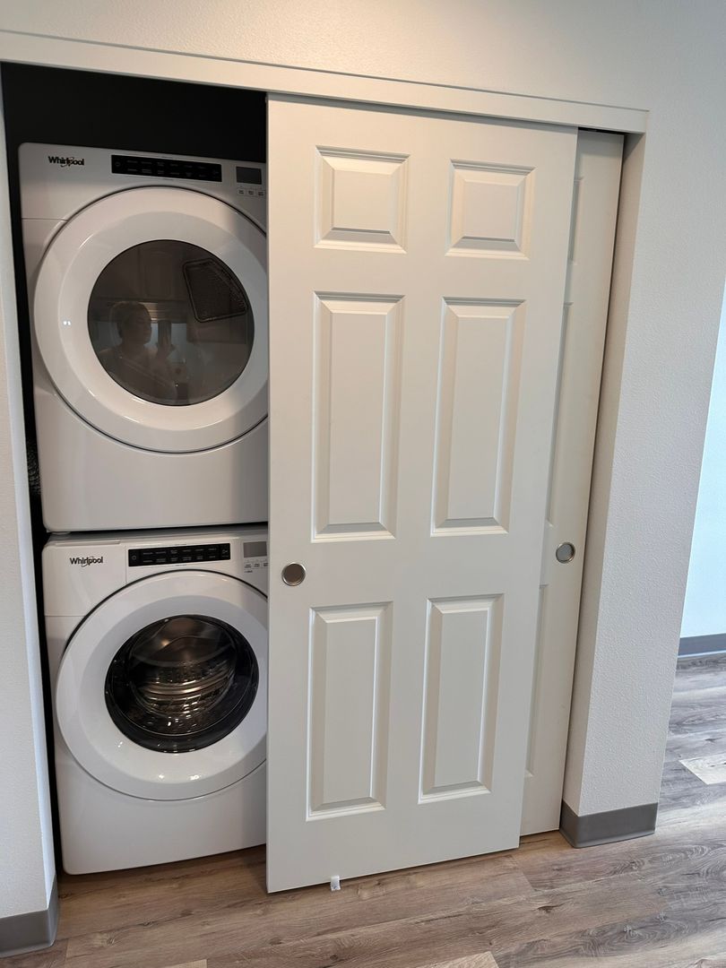 The designer kitchen includes upgraded countertops, a range, refrigerator, dishwasher, and a convenient stackable washer and dryer. Durable laminate flooring runs throughout the home for a clean, contemporary feel.